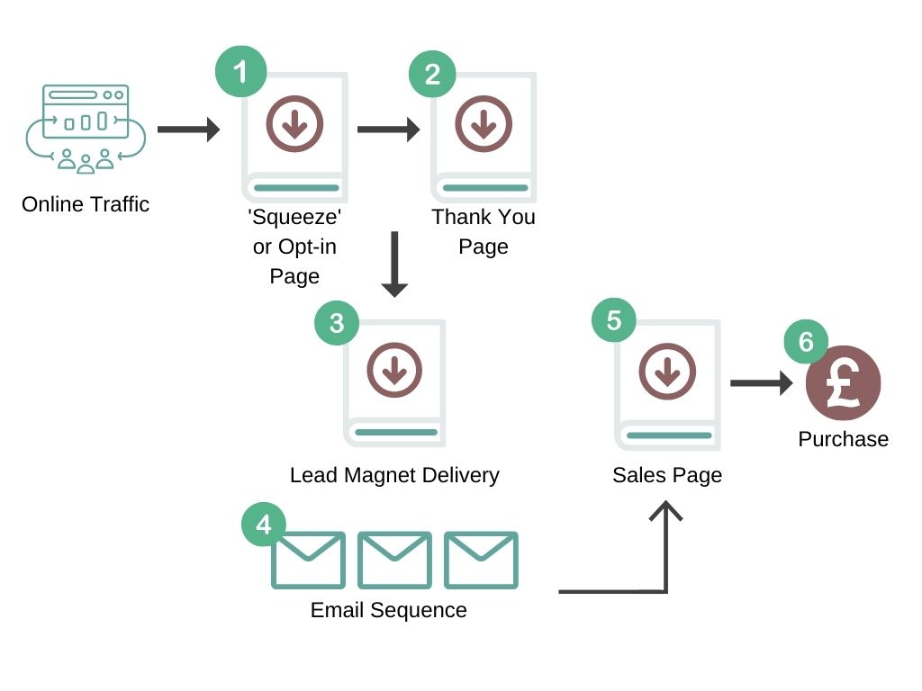 Sales funnel building software, such as Clickfunnels, provides a framework for guiding your prospects through the online sales process. So, a basic funnel might look something like this: